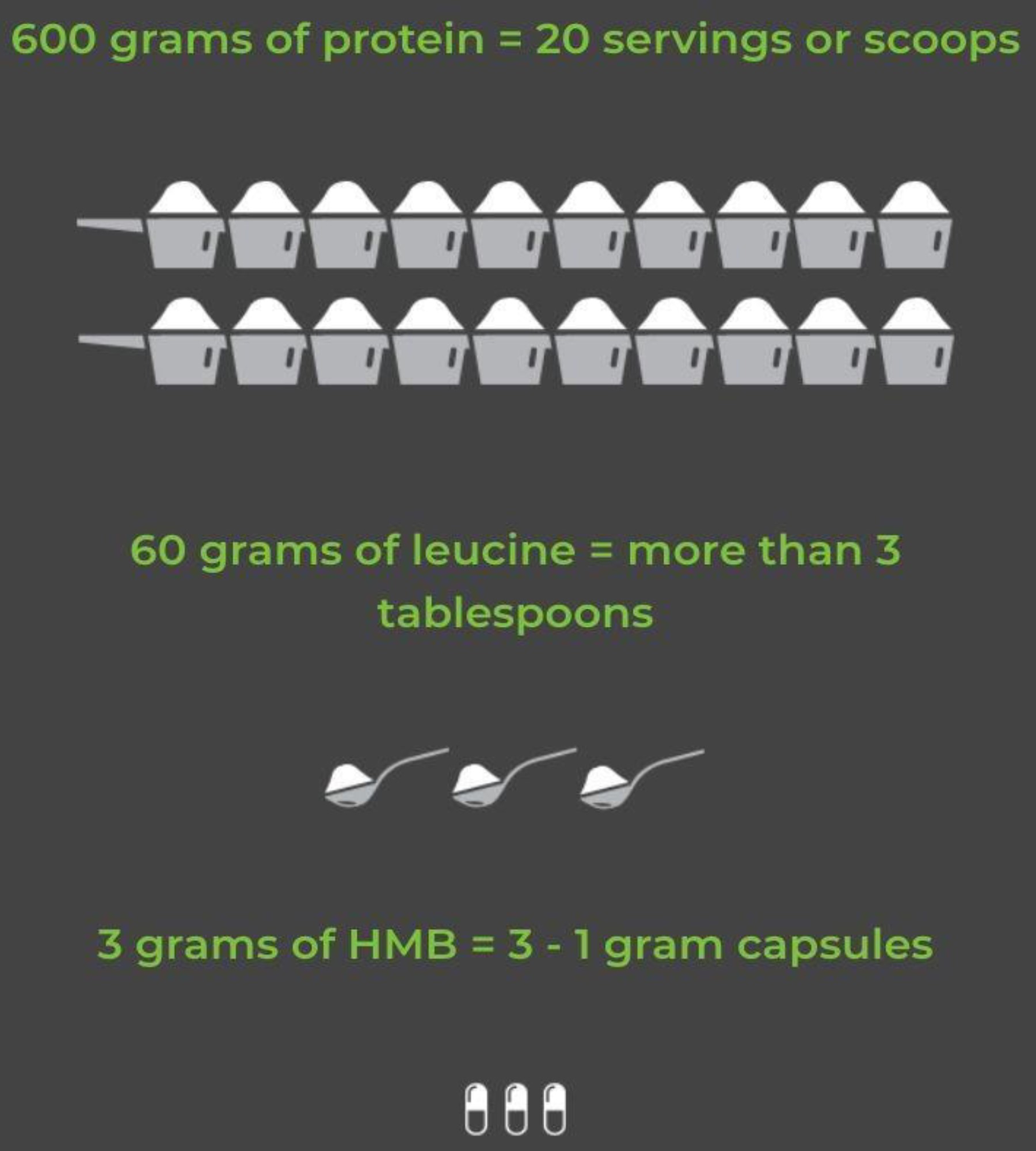 In order to benefit from HMB, supplementation is needed. While it is true that HMB is produced naturally in our bodies during the metabolism of the essential amino acid leucine, only 5% of dietary leucine is converted to HMB in the body. This means that, in theory, a person would need to consume 60 grams of leucine — or approximately 600 grams of high quality protein — to get the effective amount of HMB. Directly consuming this amount of protein or leucine is a difficult if not impossible feat.